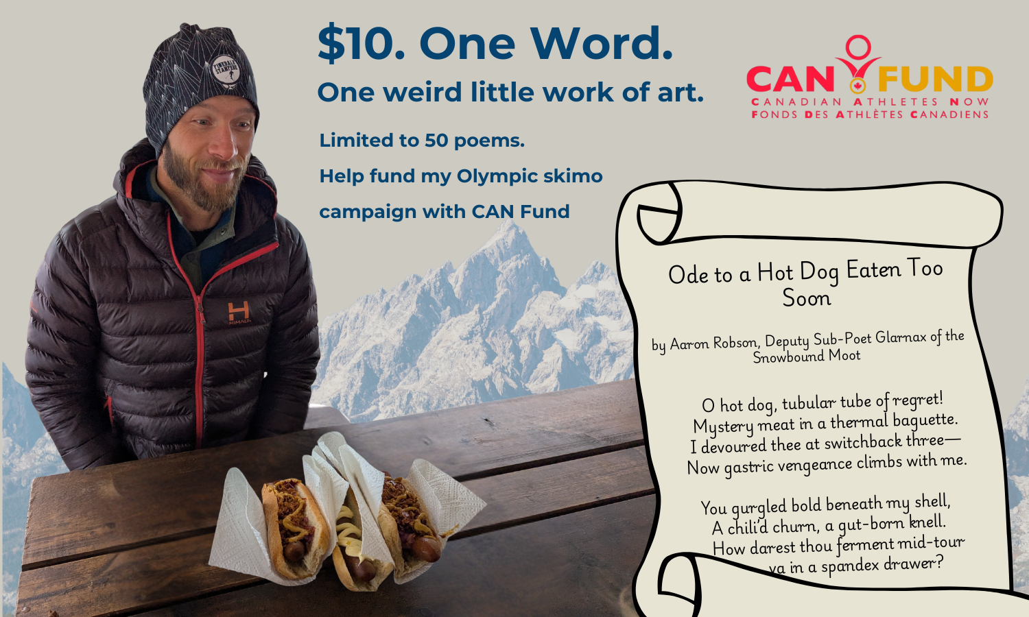 Support Aaron Robson’s Olympic skimo journey by donating to his CAN Fund Fundraiser. As a thank you, your will receive a completely unnecessary—but deeply heartfelt—custom poem.